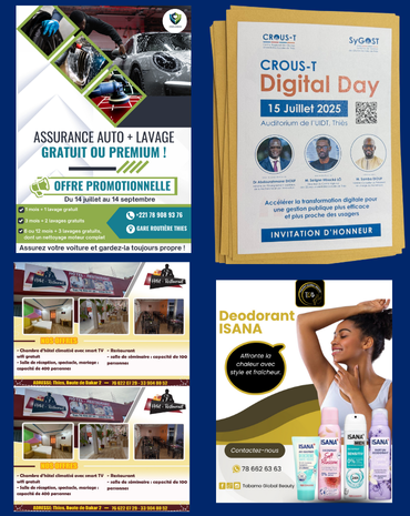Réalisations Nos quelques Réalisations Inspirez-vous pour votre prochain projet Logos Affiches et flyers Cartes de Visite Gestion de Pages Sérigraphie Developpement Web Commandez sur whatsapp